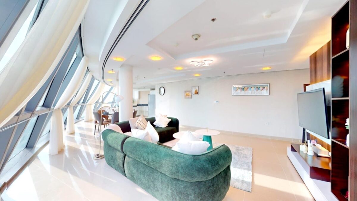 Lower Level (Social Space): A spacious, open-plan living and dining area surrounded by Park Towers’ signature curved floor-to-ceiling windows. Includes a modern kitchen and guest powder room.