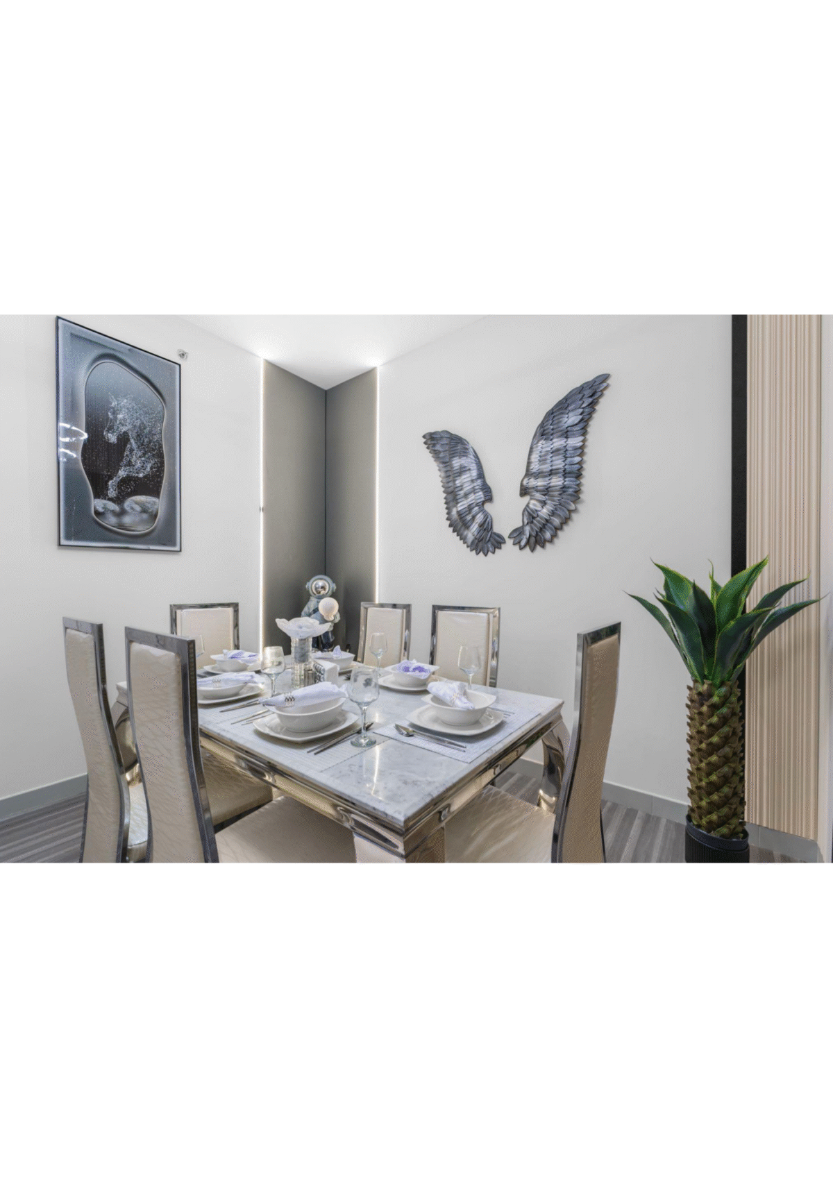With cool silver tones, contemporary furnishings, and a bright, airy atmosphere, the “Silver Aviary” is your stylish nest in the heart of Downtown Dubai.