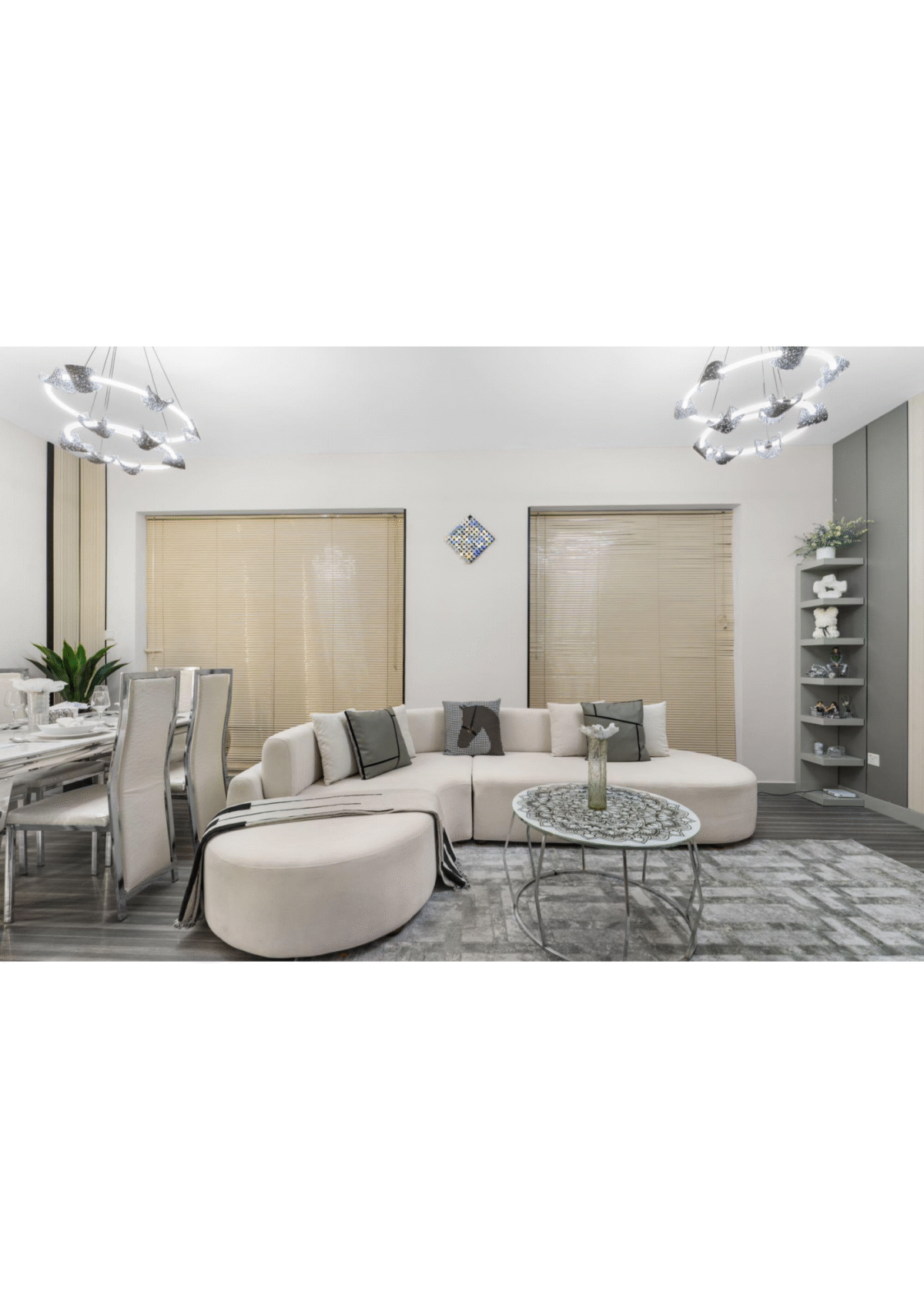 Living Room: A modern space featuring metallic accents, plush grey seating, and large windows that fill the room with natural light.