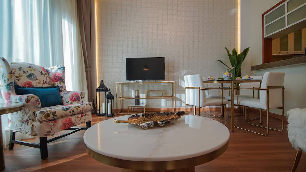 Living Area: Comfortable seating with a Smart TV and open views.